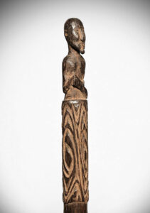 This beautifully carved Dance Staff with the finial carved in the form of a chiefly Ancestor who is holding a drum in his hands & has a tobacco pipe in his mouth. This is likely an actual portrait of the Chief or Ondafi of Bobrongko Village on Lake Sentani where I collected it in 1985 the carver was deceased as was the chief it portrayed.