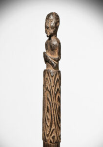 Below the figure are three wide bands of finely incised scrolling designs called fou which is a chiefly design used solely on artworks made for the chiefly families or Ondafi.