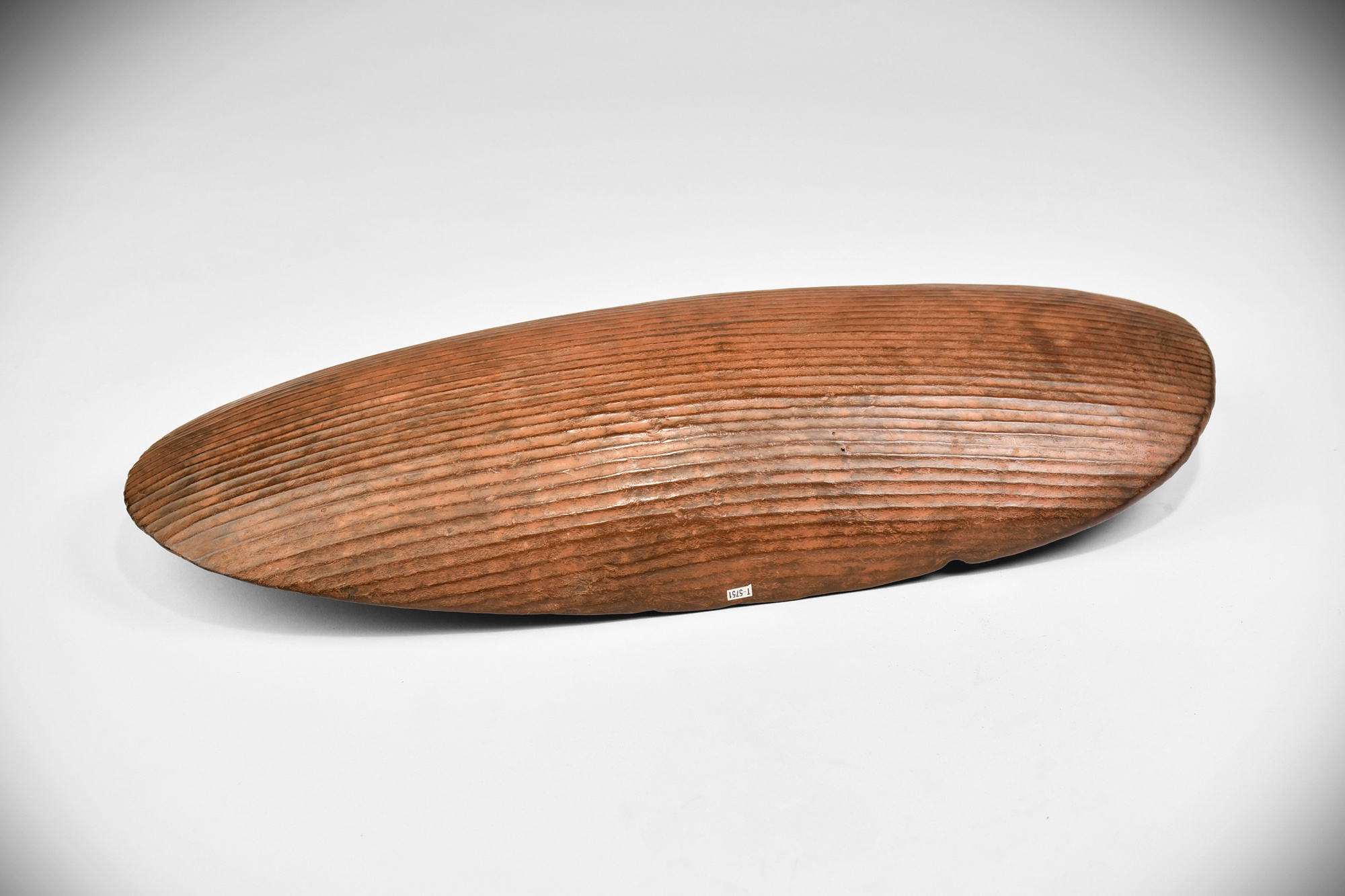 This very fine, beautiful old Coolamon is stone carved and is nearly perfect in every manner, starting with the fine shape. The overall thickness of the bowl tapers slightly to the edges, the bottom of the bowl is convex as if it were made to sit gently in one’s hands or lap, and both sides of the bowl are finely incised with the same fluted designs. The whole bowl has a deep, rich, old patina from decades of daily use and traces of red ochre applied many times over long periods.