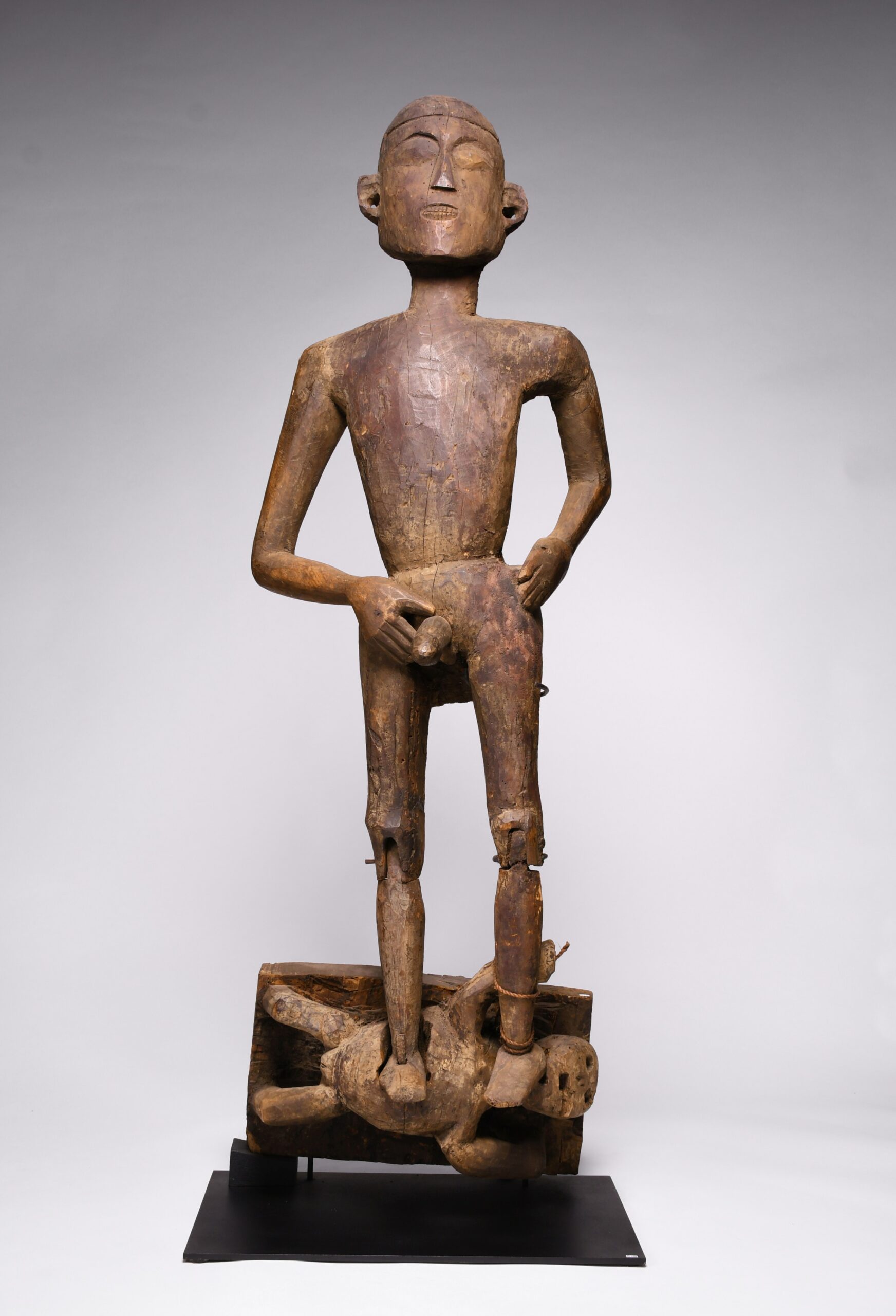 This powerful and expressive sculpture of a standing Nagaland Warrior figure trampling on a defeated enemy. This was once on the facade of the Nagaland Ceremonial House, known as a Morung. The warriors’ erect penis would have several possible meanings: the masculine aggressive aspect & fertility for their community, but also the influences from the ancient Hindu Deities like Shiva that surrounded their cultures.