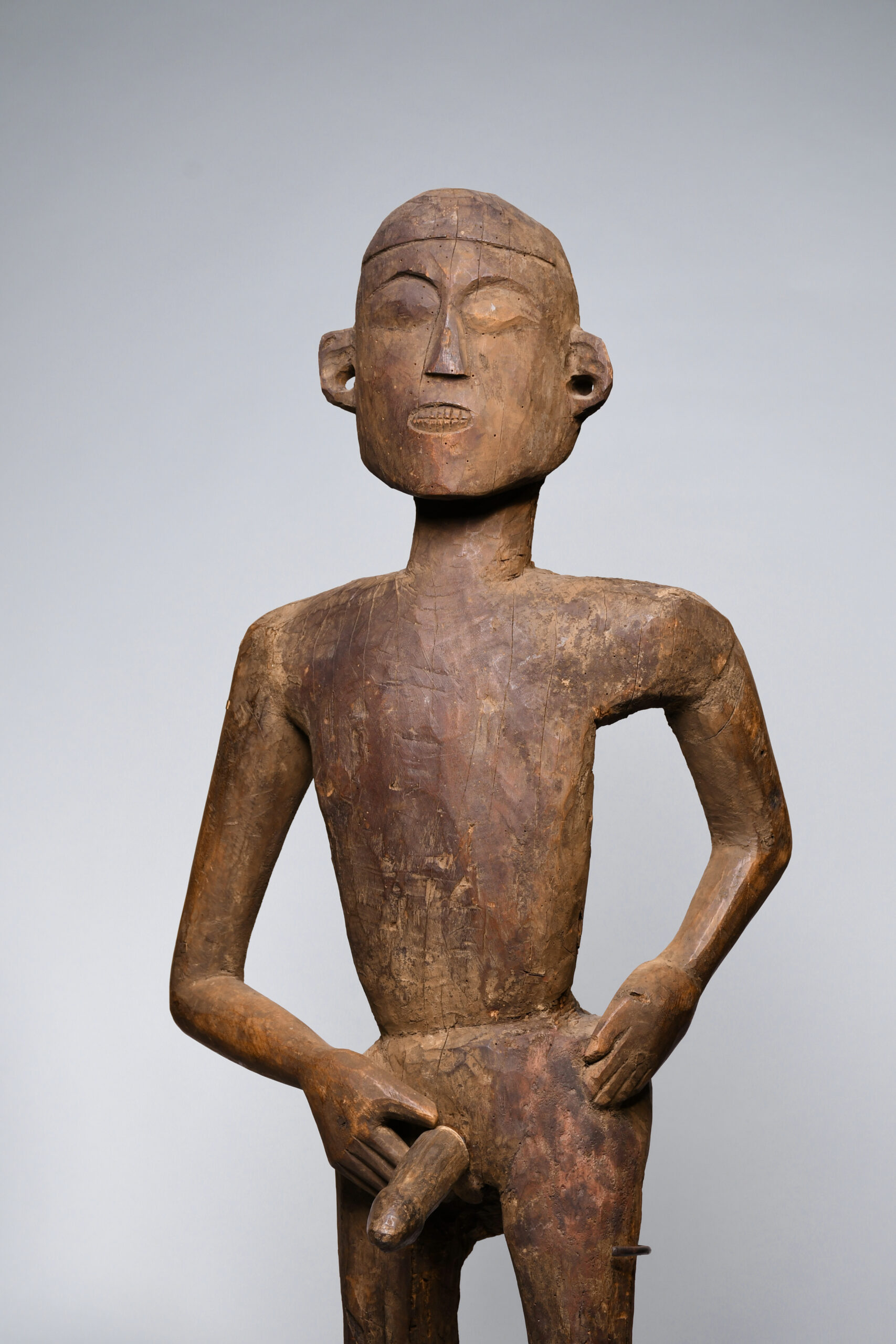 This figure was carved away from a larger architectural post as seen in photos of similar historic Morung’s buildings (below). The way that the legs on this figure are jointed at the knees was almost certainly the artist’s ingenious way of dealing with a fault in the timber of lack of remaining timber to finish the legs from the knees below.