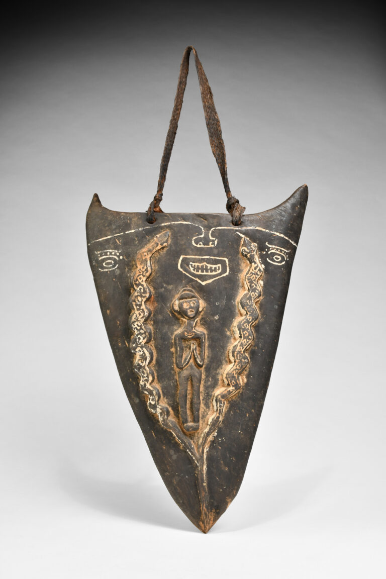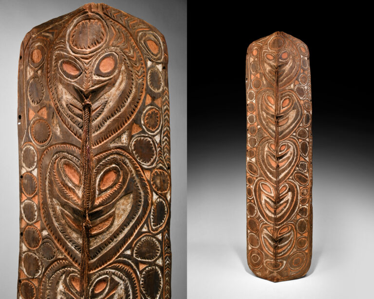 The physical protection of New Guinea Shields is only one aspect of their use, shields in New Guinea also play an important ceremonial role & often are the vessel for ancestral spirits and often have a personal name that can be invoked to overpower an enemy. Shields are often kept in Men’s ceremonial houses along with ancestral relics, old shields are family heirlooms and often have an oral history to them, the owner & their clans’ men often can tell you about every particular arrow or spear embedded in the face of the shield, they know the stories of each battle who might have been wounded or killed & how their shield with its ancestral power frightened or stunned their enemies so that they could be easily overcome.
